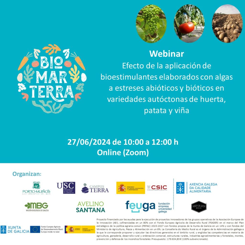 En el marco de las actividades de divulgación del proyecto BIO_MARTERRA, se organiza este webinar online gratuito en el que cada una de las entidades participantes en el Grupo Operativo gallego comentarán el papel que están llevando a cabo en el proyecto, así como el impacto positivo que este tendrá en los sectores agrícola y de algas marinas. De este modo, el webinar contará con las ponencias de Porto-Muiños S.L., la Unidad de gestión de residuos y fertilización del grupo Agronomía de la Universidade de Santiago de Compostela, el grupo de investigación VIOR de la Misión Biológica de Galicia-CSIC, el productor Avelino Santana y la Fundación Empresa Universidad Gallega (FEUGA). Además, se contará también con la participación de las dos entidades colaboradoras del proyecto, el Centro de Investigacións Agrarias de Mabegondo (CIAM-AGACAL) y Horta da Lousa.