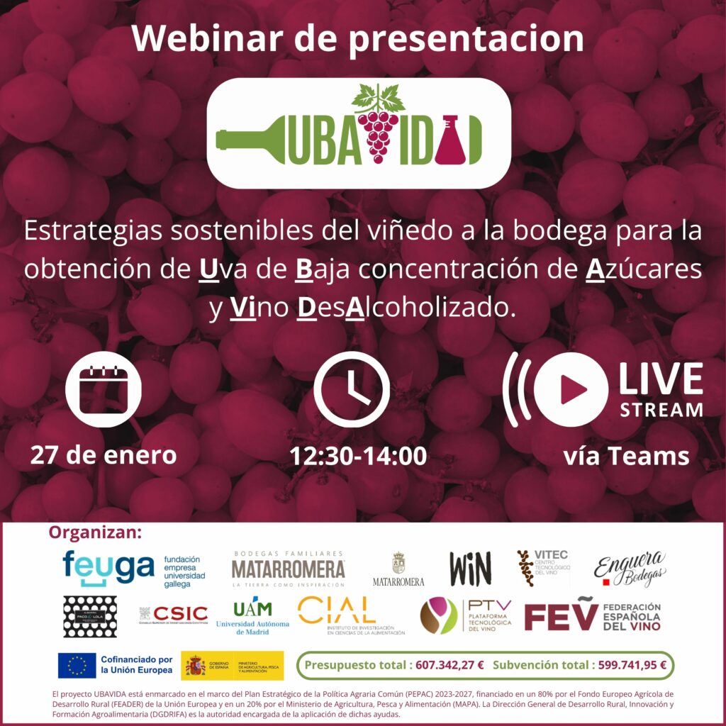 En el marco de las actividades de divulgación del proyecto UBAVIDA, se organiza este Webinar online gratuito en el que representantes de las entidades participantes expondrán los objetivos, actividades, y resultados que se esperan obtener en este proyecto de innovación y su impacto positivo en el sector vitivinícola. De este modo, el Webinar contará con ponencias de FEUGA, la Federación Española del Vino (FEV), Bodegas Enguera, Bodegas Familiares Matarromera, y el Instituto de Investigación en Ciencias de la Alimentación (CIAL) del CSIC-UAM. Sin embargo, el Grupo Operativo UBAVIDA no se limita a estas entidades ya que también forman parte del consorcio la bodega WIN SIN ALCOHOL, la Plataforma Tecnológica del Vino (VITEC), la bodega PACO & LOLA y la Plataforma Tecnológica del Vino (PTV).