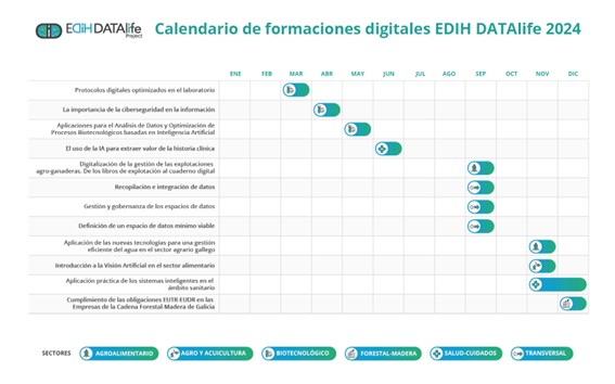 Esta formación se enmarca dentro de una serie de formaciones que el proyecto europeo EDIH DATAlife está realizando para impulsar la adopción de tecnologías disruptivas en sectores estratégicos de Galicia, entre los que se encuentra el sector agroalimentario, pero también las cadenas de valor de pesca-acuicultura, biotecnología, forestal-madera y salud-cuidados. Pueden consultarse todas las formaciones que ya se han hecho y que se harán durante este año 2024 en el siguiente calendario: