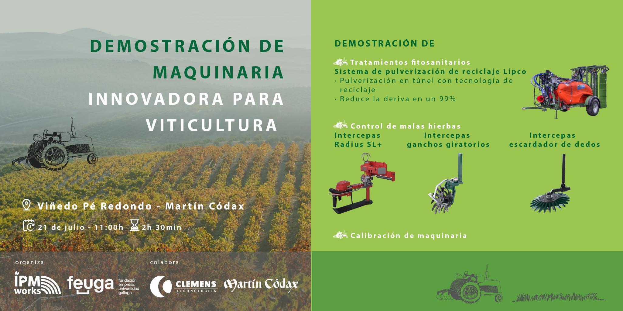 Unha vez máis unimos forzas co proxecto europeo H2020 IPMworks para presentar unha xornada de demostración de maquinaria agrícola innovadora que promete un gran cambio na aplicación de fitosanitarios en viticultura. O evento, que conta coa colaboración de Clemens Technologies e Adegas Martín Códax, terá lugar o 21 de xullo ás 11:00h no Viñedo Pé Redondo das Adegas Martín Códax, baixo o título Demostración de maquinaria innovadora para viticultura.