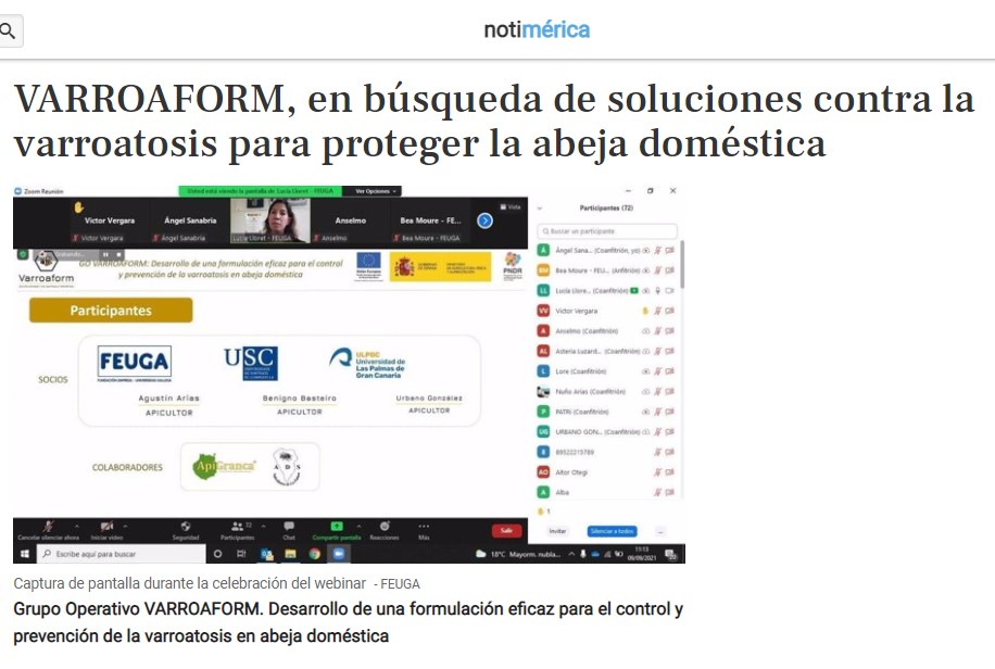 O pasado xoves 9 de setembro, o Grupo Operativo VARROAFORM celebrou o webinar divulgativo do proxecto. Un evento co que se deron por finalizadas as accións de divulgación do proxecto de innovación, xa na súa fase final de execución. O éxito de asistencia ao webinar foi días despois potenciado coa enorme difusión que fixo a prensa escrita, nacional e internacional, sobre VARROAFORM.