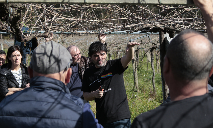 En el viñedo experimental de Bodegas Martín Códax tuvo lugar la sesión práctica de poda, impartida por Julián en colaboración con parte del equipo técnico de la bodega. Predominó la interacción entre todos los asistentes, construyéndose así un aprendizaje colectivo para compartir distintos modos de hacer. Entre vigor, sentido de la savia, yemas, sarmientos, pulgares, varas y chupones, la sesión sirvió para demostrar las mejores estrategias con la cepa según lo que se quiera conseguir de ella cuando se hace la poda en seco propia de estos meses. Julián, los podadores y los asistentes, resolvieron, prestando una alta atención al detalle y fomentando el debate, la poda de dos cepas, una de espaldera y otra de parral.