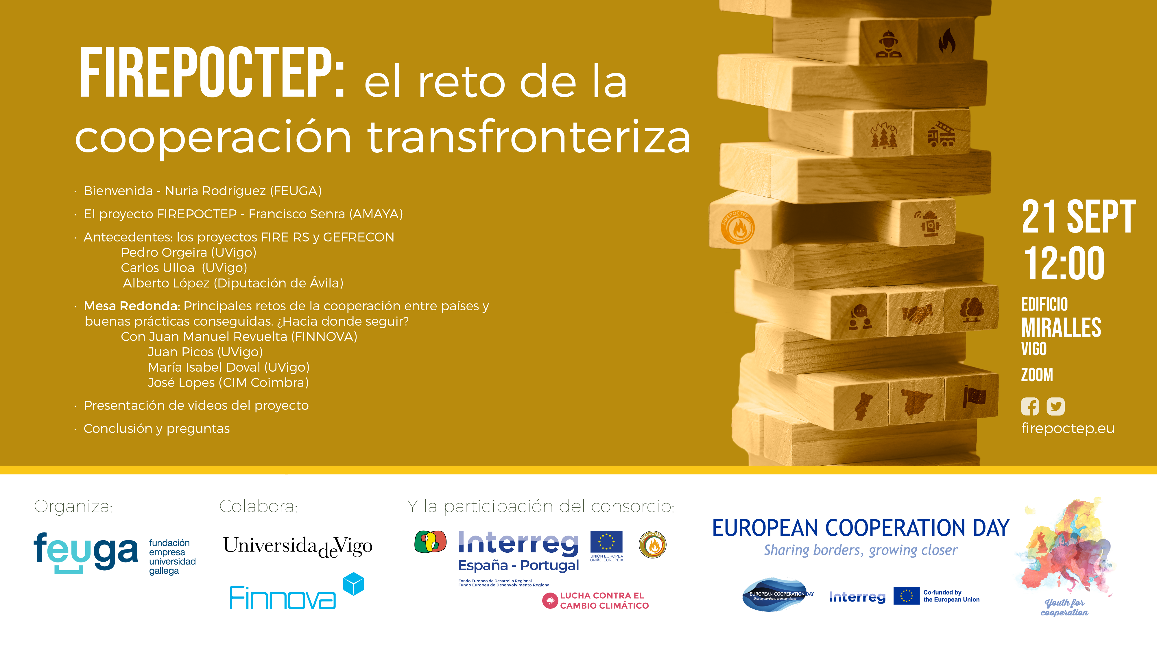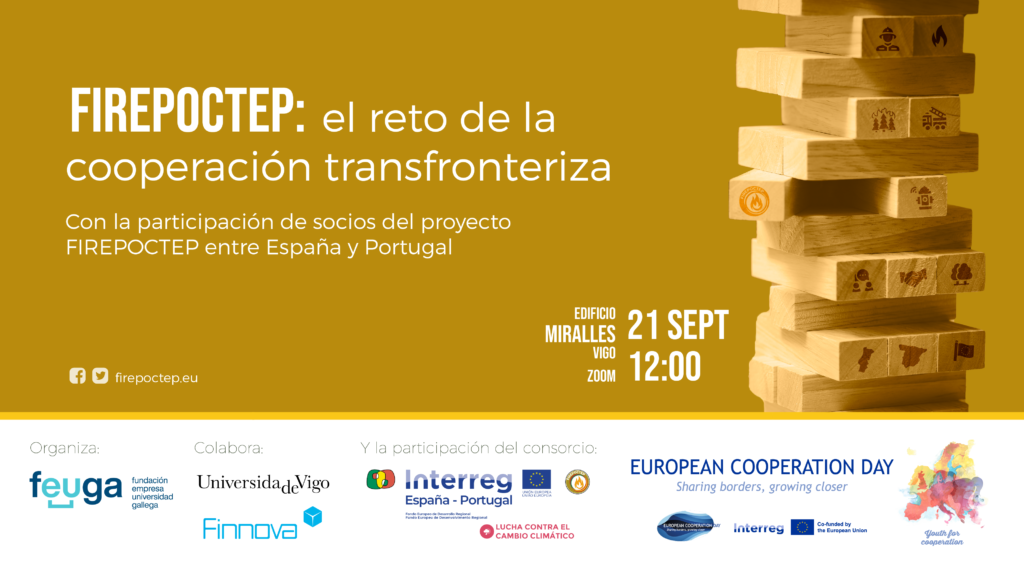 Los socios del proyecto de innovación FIREPOCTEP, entre los que nos encontramos, son los impulsores del evento “El reto de la cooperación transfronteriza”, enmarcado dentro del Día Europeo de la Cooperación (European Cooperation Day), que tendrá lugar el 21 de septiembre a las 12 horas en el edificio Miralles del campus de la Universidade de Vigo. Durante esa fecha se llevarán a cabo diferentes iniciativas ensalzando la importancia de la cooperación entre países en todo el territorio europeo. Organizado por FEUGA en colaboración con la Universidad de Vigo y FINNOVA, la cita tendrá un formato híbrido, presencialmente en Vigo y con posibilidad de asistir y participar de forma online mediante Zoom. El objetivo de la organización es acercar a la sociedad la importante labor que viene llevando a cabo este proyecto desde principios de 2020, a través de una puesta en común experiencias de los socios a ambos lados de la frontera entre España y Portugal.