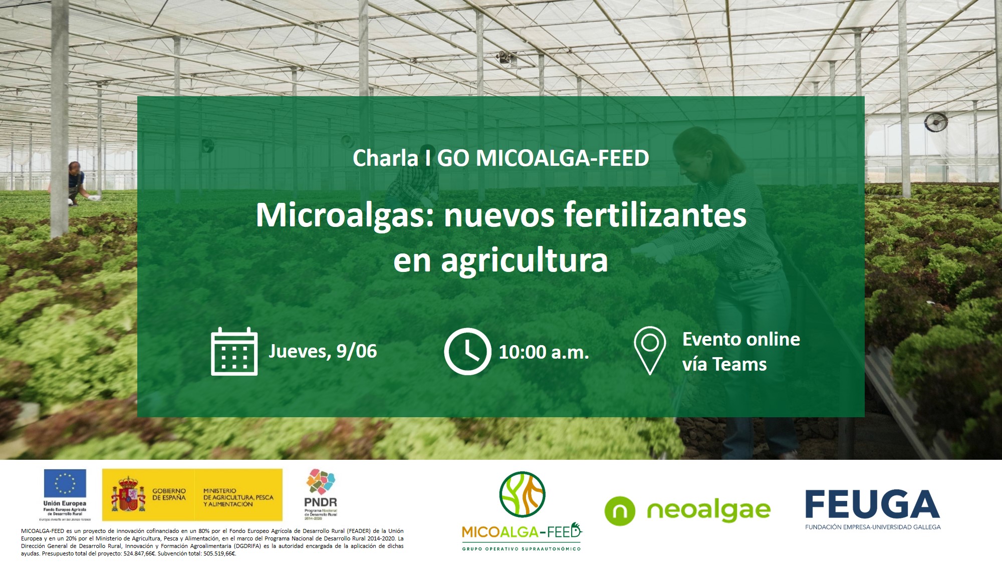 El Grupo Operativo MICOALGA-FEED, del que FEUGA es representante, organiza, en el marco del plan de divulgación del proyecto, la primera de las charlas con agentes del sector. Esta charla está centrada en uno de los ejes del proyecto: las microalgas y, concretamente, en sus aplicaciones y potencial como fertilizante en agricultura.